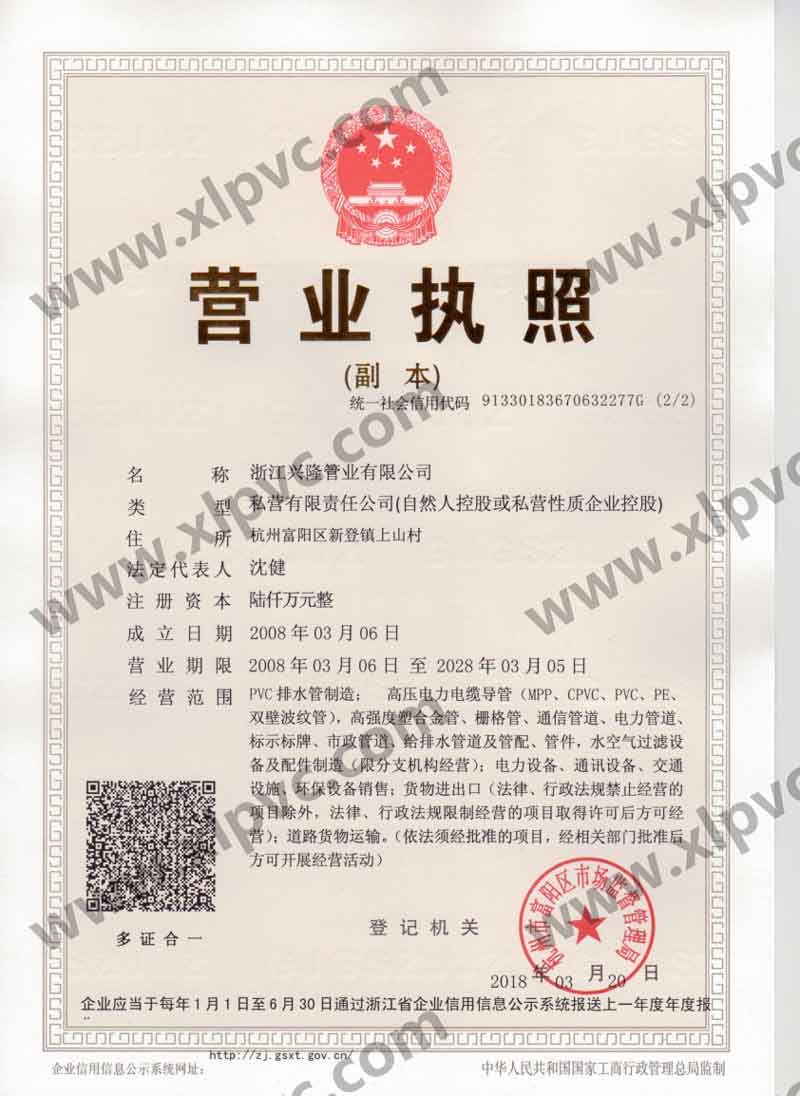 浙江興隆管業(yè)有限公司位于杭州市富陽區(qū)(杭州第九新區(qū)),坐落在新登鎮(zhèn),相距杭州僅60公里,水、陸、空交通運輸十分便利。浙江興隆管業(yè)有限公司前身為富陽興隆塑料制品廠,成立于1992年,2008年改名浙江興隆管業(yè)有限公司,數(shù)十年來,公司一直至力于管道的生產(chǎn),目前公司擁有國內(nèi)先進(jìn)的CPVC保護(hù)管生產(chǎn)線,HPVC()雙壁波紋管生產(chǎn)線,多孔管生產(chǎn)線,玻璃鋼電纜保護(hù)管生產(chǎn)線、MPP電纜保護(hù)管生產(chǎn)線。生產(chǎn)的主要產(chǎn)品有:CPVC電纜保護(hù)管、MPP電力電纜保護(hù)管(頂管)、高強度塑合金管、HDPE給排水管、HPVC()雙壁波紋管、玻璃鋼電纜保護(hù)管、埋地通信用的PVC-U多孔管、PE直壁管、PVC-U雙壁波紋管、梅花管等,年生產(chǎn)能力達(dá)20000萬米。